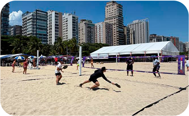 Foi com esse propósito que apoiamos a montagem de seis quadras de beach tennis na Praia do Gonzaga, em Santos, litoral de São Paulo. A iniciativa contribuiu com a instalação de redes, postes, guarda-sóis e toda a estrutura necessária para que moradores e visitantes possam praticar esporte ao ar livre com conforto e segurança.